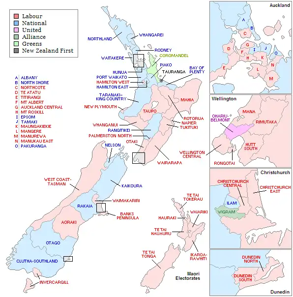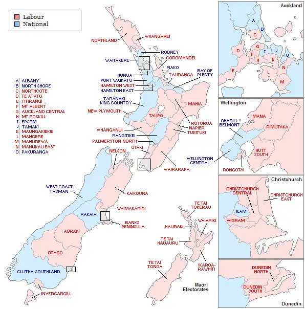 • By Labour: Banks Peninsula, Hamilton West, Maungakiekie, Northcote, Rotorua and Wairarapa were captured from National. Te Tai Hauauru and Te Tai Tokerau were captured from Mauri Pacific. Wellington Central was captured from ACT. Te Tai Tonga was captured from New Zealand First.