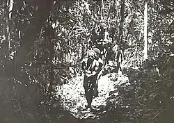 Elsewhere, 'A' Company was sent to Bougainville in November 1944,[6] initially concentrating around Cape Torokina. Several platoons were sent to support the 29th Brigade's southern drive towards Buin, carrying out reconnaissance and patrol operations,[7] while another platoon supported the 11th Brigade in the centre of the island along the Numa-Numa trail. As these brigades were in turn rotated to the rear for rest, the platoons continued to support the replacement brigades (the 7th, 15th and 23rd).[3] 1 NGIB troops were involved in numerous small scale skirmishes during the course of the campaign. In December 1944 alone, these patrols killed 41 Japanese and captured eight others in several engagements, while the battalion also detached guides to the Australian infantry battalions, earning a reputation of being able move silently through the bush and locate Japanese patrols and ambushes. Close to the end of the month, a patrol crossed the Adele River to form a base for further operations, and then held off a Japanese attack around the Hupai River, before withdrawing towards Tavera.[8] In late January 1945, a long range patrol was moved by sea to Motupena Point, from where they attacked a Japanese outpost.[9] The following month, a patrol exploited towards Mosigetta.[10] On 29 March 1945, a platoon from 1 NGIB attacked a Japanese camp around Buritsiotorara, killing seven Japanese with machine gun fire and grenades. The next day, the platoon exploited further along the Wakunai River to Aviang, where another three Japanese were killed.[11]