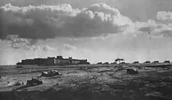 Deployed at Matruh and responsible for constructing defensive positions, the division was still not considered ready for operations by the end of June – having 90% of its allotted transport (many vehicles being those which had been used in the East Africa campaign) and 90% of its arms and equipment.[26] Severe administrative problems, as well as organizational issues related to integration of the division into the Western Desert Force, caused discontent and eventually lead Gen. Brink to raise the issues with Field-Marshal Smuts and the Chief of SA General Staff when they visited Cairo in early July.[27] Discussions indicated that Lt-Gen. Sir Alan Cunningham and Wavell were of the opinion that South Africa could not field two divisions[nb 5] for lack of resources. Smuts claimed that the manpower shortages were due to troops being retained for protection duties in East Africa and that a lack of shipping precluded the arrival of a further 3,000 men and he rejected the idea of reducing the South African forces into divisions of two brigade strength, as was recommended by Wavell.[28] In addition, Brink continued to express his displeasure at the fact that the 1st Division was being utilised to construct defensive positions, instead of training in order to prepare for operations.