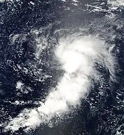 On July 13 a cluster of thunderclouds grouped together to form a low pressure area. On July 14 it started to organize and slowly became a tropical depression on July 19, and quickly intensified into a tropical storm. On July 22 convection was displaced to south of the storm's center due to high wind shear, and caused it to dissipate.