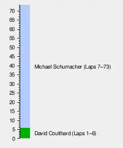 At the end of the first lap, Coulthard led from Michael Schumacher, Häkkinen, Barrichello, Trulli and Button.[82] Coulthard had a 1.7-second lead over Michael Schumacher by the end of lap two.[59] Button attempted to overtake Trulli for seventh on the back straight, but the two collided. Both drivers went off the track and made pit stops to replace rear punctures, dropping to the back of the field.[57][67] Frentzen overtook Ralf Schumacher for sixth place, Zonta passed Diniz for eighth, while Verstappen advanced two spots to tenth after passing Irvine and Wurz.[59] On lap three, De La Rosa passed Heidfeld for 13th place, and Gené passed Fisichella for 17th. Coulthard's lead over Michael Schumacher was cut to one second on the following lap. De La Rosa moved up the field by passing Wurz for twelfth.[59][83] On lap five, Alesi became the first driver to make a pit stop for dry tyres.[75][59] The first three drivers were close together,[80] and Michael Schumacher, having generated enough heat in his tyres,[7] began attacking Coulthard for the lead on the same lap that the latter was asked to slow down in order to slow Schumacher and allow his teammate Häkkinen to close in and challenge the Ferrari driver.[79][84] Michael Schumacher came closer on Coulthard in the infield segment, challenging him for the lead.[85]