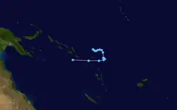 On December 31, the FMS began monitoring a new tropical depression, classified as 05F, roughly 600 km (370 mi) east-northeast of the Solomon Islands. A large system, similar to a monsoonal depression, 05F drifted southeastward for several days before turning towards the southwest.[11] On January 1, the system attained its peak intensity with winds of 65 km/h (40 mph) and a pressure of 998 mbar (hPa; 29.47 inHg).[12] Despite having gale-force winds, the system was not classified as a tropical cyclone since the winds were significantly displaced from the center of circulation. The JTWC determined the system had a good chance of developing into a tropical cyclone and issued a Tropical Cyclone Formation Alert (TCFA); however, this was later canceled as the depression failed to strengthen. By January 6, the system crossed 160°E and entered the Australian Bureau of Meteorology's area of responsibility.[11]
