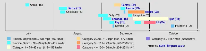 Tropical cyclogenesis began with Tropical Storm Arthur, which formed just offshore North Carolina on July 14. Following the storm's extratropical transition on July 16, no further activity occurred until Tropical Storm Bertha developed near Louisiana on August 4. Cristobal formed on the next day, while Dolly developed on August 29.[10] September featured eight named storms, a record which was later tied in 2007 and 2010 and surpassed in 2020.[13] During that month, Gustav reached hurricane intensity on September 11, the latest date of the first hurricane in a season since 1941.[14] While the long-lasting Kyle and Lili persisted into October, only one tropical cyclone developed that month, Tropical Depression Fourteen on October 14. The depression was absorbed by a cold front while crossing Cuba two days later, ending seasonal activity.[10]