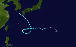In the beginning of April, a tropical disturbance developed along the southern end of a stationary cold front west of Enewetak Atoll.[11] While gradually organizing, the system produced gale-force wind gusts in Micronesia.[25] On April 5, the JTWC initiated advisories on Tropical Depression 04W. The system moved northwestward due to a nearby extratropical storm, which later caused the depression to also become extratropical about 650 km (400 mi) west-southwest of Wake Atoll.[11] The JMA issued its last advisory on April 8.[11]
