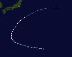 While accelerating northeastward, Hagibis developed a well-defined eye and underwent a period of rapid deepening.[26] On May 19, the JMA estimated peak 10-minute winds of 175 km/h (109 mph),[10] and the JTWC estimated 1-minute winds of 260 km/h (160 mph);[11] this made Hagibis become a second super typhoon after Mitag. At the time of its peak, the typhoon was located about 305 km (190 mi) west-southwest of the Northern Mariana Islands.[26] Hagibis only maintained its peak for about 12 hours,[10] after which the eye began weakening.[26] The trough that caused the typhoon's acceleration also caused the storm to lose tropical characteristics, and dry air gradually became entrained in the circulation.[26] On May 21, Hagibis became extratropical to the east of Japan after having weakened below typhoon intensity. The remnants continued to the northeast and dissipated south of the Aleutian Islands on May 22.[10]