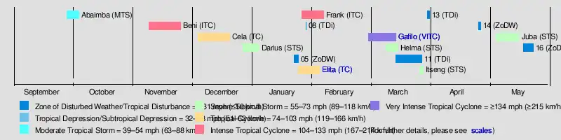 Météo-France's meteorological office in Réunion (MFR) is the official Regional Specialized Meteorological Center for the South-West Indian Ocean, tracking all tropical cyclones from the east coast of Africa to 90° E.[1] The agency tracked 16 tropical disturbances during the season, of which ten intensified into tropical storms and were named from a sequential list. This is near the long-term average of nine tropical storms. Five storms intensified to tropical cyclone status, with maximum sustained winds of at least 120 km/h (75 mph); this is also near the long-term average. There were 19 days – one less than average – in which a tropical cyclone was active.[2] The Joint Typhoon Warning Center (JTWC), which is a joint United States Navy – United States Air Force task force– also issued advisories for storms in the basin.[3]