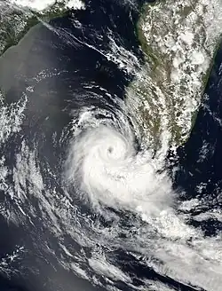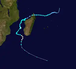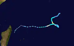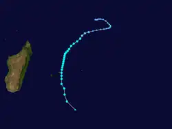 The cyclone moved southwestward through the country, disrupting the inner convective core. The large dropped over 275 mm (10.8 in) of rainfall and produced 107 km/h (66 mph) winds on Mayotte. On March 8, Gafilo emerged into the Mozambique Channel, and soon after turned to the southeast, moving ashore southwestern Madagascar late on March 9 as a severe tropical storm. The storm meandered over southern Madagascar for three days before emerging off the island's east coast on March 13. Passing south of Réunion, Gafilo transitioned into a subtropical storm on March 14, before becoming an extratropical cyclone the next day. The storm turned back to the west, dissipating on March 18 south of Réunion.[2]