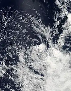 A central dense overcast organized over Helma's center, briefly developing an eye feature on March 11. That day, the MFR estimated peak winds of 110 km/h (70 mph), making Helma a severe tropical storm. The JTWC, which designated the system Tropical Cyclone 17S, upgraded Helma to the equivalent of a minimal hurricane with peak winds of 120 km/h (75 mph). An approaching trough increased wind shear and caused the storm to weaken, leaving the center exposed by late on March 12. After turning to the south, Helma turned back to the southwest as a weakened depression, later turning to the southeast ahead of a cold front. The circulation dissipated on March 16 without affecting land.[2][18]