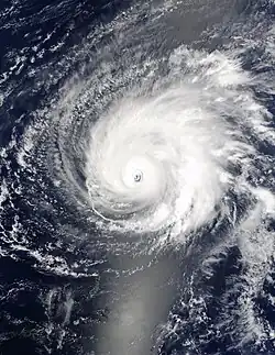 Kujira developed from a broad area of disturbed weather as a tropical depression on April 9 well removed from any landmasses.[13] Shortly after development, Kujira quickly intensified in its early stages, and was upgraded to a tropical storm just two days after cyclogenesis. Strengthening slowed afterwards, though the storm attained typhoon intensity on April 14. Intensification continued and late on April 15, Kujira reached its peak intensity with winds of 165 km/h (103 mph) and a minimum barometric pressure of 930 mbar (hPa; 27.46 inHg).[12] Following peak intensity, Kujira would begin to track northwest and oscillate in strength, cresting an additional two times in intensity. On April 21, the typhoon was downgraded to tropical storm intensity and began to track erratically for several days east of Taiwan. However, on April 24, Kujira would resume a northward track and begin to weaken, and on April 24 was downgraded to tropical depression strength as it made landfall on Kyushu.[13] Following landfall, Kujira transitioned into an extratropical cyclone on April 25, which persisted until crossing the International Dateline towards the end of April 2003.[17]