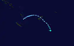 On December 21, RSMC Nadi reported that Tropical Disturbance 04F had developed, along an active and slow-moving monsoon trough near French Polynesia.[1] The depression was in an area of high shear, with the deep convection located to the northeast of the center. The low level circulation center at this time was exposed but was developing despite the high shear associated with the system. Early on December 24 deep convection associated with the system moved over the low level circulation center whilst the system was getting better organized. Later that day at 1800 UTC the Depression was upgraded to a category one tropical cyclone and was named Judy whilst located about 510 km (320 mi) southeast of Tahiti and moving towards the southwest. During the next few hours under strengthening shear, Judy struggled to maintain itself. However, as it moved further to the south it came under a strengthening steering field which was being enhanced by a trough of low pressure to the west of the steering field which helped to neutralize the effect of the shear over the cyclone. Judy then intensified slightly further and reached its peak intensity of 85 km/h (50 mph), with a peak pressure of 989 hPa late on December 25 whilst turning towards the south towards TCWC Wellington's area of responsibility. Judy degenerated into an extratropical cyclone during December 27, before it was last noted later that day as it merged with an area of low pressure to the south of Tahiti.[1][2]