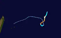 Moving southeastward in the flow of the trough, the small storm began weakening on February 20 due to strong northwesterly wind shear, which caused the convection to dwindle over the circulation. That day, the storm passed just 80 km (50 mi) north of Mauritius, by which time the center was exposed and the intensity had dropped to tropical depression status. It turned back to the northwest, steered by the low-level trade winds and following its previous path.[3] Late on February 20, the JTWC discontinued advisories,[30] and three days later, the circulation dissipated off the east coast of Madagascar.[3]