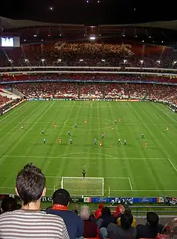 Benfica first competitive game of the season was the third qualifying round of the Champions League.[38] Before the match, Santos expressed the importance of reaching the group stage: "More important than the formation used is to fulfil our purpose: take part in the group stage of the competition."[39] On 8 August, Benfica visited the Ernst-Happel-Stadion to play Austria Wien.[38] Benfica scored first with a back-heeled goal from Nuno Gomes in the 16th minute, while Austria equalized through Jocelyn Blanchard in the 36th minute. The match resulted in a draw and Benfica gained a decisive advantage for the second leg.[40] On 22 August, Benfica hosted Austria Wien for the second leg.[38] The opening goal came from Rui Costa, with further Benfica goals scored by Nuno Gomes and Petit.[38] Benfica had joined their rivals Porto and Sporting in the 2006–07 Champions League, marking the first time three Portuguese teams were present in the group stage.[41] On 24 August, Benfica took part in the Champions League draw; they were drawn with Manchester United, Celtic and F.C. Copenhagen.[42] It was second time in a row Benfica played with Manchester United in the group stage after eliminating them in 2005–06.[42] Three days later, Benfica were due to meet Belenenses for the opening game of the Primeira Liga.[43] However, because of the "Mateus Affair," the game was uncertain to occur; Santos expressed hopes for the quick resolution of the case, adding that it was bad for Portuguese football and that the uncertainty caused his players to lose focus.[44] Two days before the match, the Portuguese Professional Football League announced that the game was postponed until the Portuguese Football Federation decided the outcome of the affair.[45]