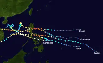 On September, an unnamed and unclassified tropical storm have been discovered by meteorologist Gary Padgett and Dr. Karl Hoarau. Later, Typhoon Xangsane affected Luzon, Philippines, causing major damages with more than 200 people dead.[11] The country saw four storms making landfall, with three of them reaching Category 4 or 5 super typhoon status. Typhoon Cimaron made landfall over in northern Luzon as a Category 5 super typhoon with minimal damages.[12] By November, Typhoon Chebi made landfall in the same area as Cimaron, though effects from the typhoon were much smaller than Cimaron. Although by late November, Typhoon Durian made landfall in Bicol region. Combined effects with ash from the Mayon Volcano had killed over 1,500 people and damages at least US$530 million. Durian also crossed the basin and into the North Indian Ocean basin, the first time since 2003. During early December, two systems formed. Typhoon Utor crossed Visayas with minimal damage; and Tropical Storm Trami, a very weak system that didn't affect any landmasses became the final tropical cyclone and dissipated on December 20.[1]