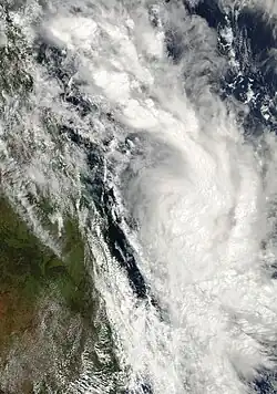 The Tropical Cyclone Warning Centre (TCWC) in Brisbane began issuing warnings on a developing tropical low which was located near the southern Papua New Guinea mainland on 13 November 2007,[12] while the Joint Typhoon Warning Center (JTWC) issued a Tropical Cyclone Formation Alert on the storm.[13] Later that day, the JTWC issued its first advisory, designating the low as Tropical Cyclone 02P.[14] TCWC Brisbane initiated tropical cyclone advisories on the tropical low early on 14 November. Shortly after, TCWC Brisbane upgraded the system to Tropical Cyclone Guba, which was a name assigned by the TCWC in Port Moresby.[15] Guba drifted erratically off the Queensland coast for the next two days, and intensified on 16 November, becoming a Category 3 severe tropical cyclone. Guba was a small, but intense system, forming a well-defined eye. Guba began weakening on 17 November as it started to accelerate to the west towards the Queensland coast. However, it later turned northwards, avoiding the Australian mainland, then north-east while it continued to weaken. TCWC Brisbane downgraded Guba below tropical cyclone strength, and issued its last advisory early on 20 November.