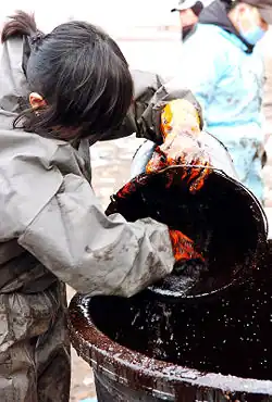 A volunteer worker collects oil from the beach