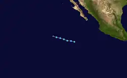 On May 24, a tropical wave emerged off the western coast of Africa. The wave entered the eastern Pacific around June 6 and shower and thunderstorm activity began to increase shortly thereafter. A broad area of low pressure formed a few hundred miles south of Acapulco, Mexico two days later.[19] Following satellite evidence of a well-defined circulation and organized convective activity,[20] the National Hurricane Center upgraded the disturbance to a tropical depression at 1200 UTC on June 11. After attaining winds of 35 mph (56 km/h) and a minimum barometric pressure of 1004 mbar (1004 hPa; 29.6 inHg), the depression began to traverse cooler waters and much more stable air. This caused all associated convection to fade away, and the depression degenerated to a non-convective remnant low at 0000 UTC on June 13. The remnant low continued northwest until dissipation by 0600 UTC on June 15.[19]