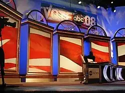 Both Clinton and Obama appeared in a debate moderated by ABC News on April 16, 2008, at 8 PM EDT at the National Constitution Center.[61] The debate was nationally televised at 8 PM Eastern and Pacific (tape delayed) and 7 pm Central/Mountain (tape delayed). This was the second debate shown nationally on over-the-air television.[62]