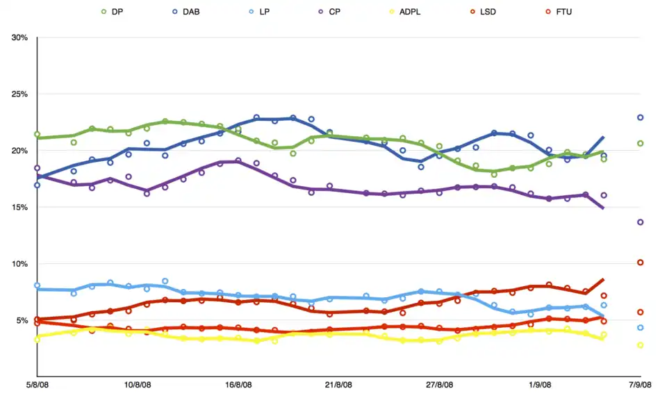 The 2008 Hong Kong Legislative Council election was held on 7 September 2008[1] for the 4th Legislative Council since the establishment of the Hong Kong Special Administrative Region. There were 60 seats in the 4th Legislative Council, with 30 members elected by geographical constituencies through direct elections, and 30 members by functional constituencies.[2] Candidates for 14 functional constituency seats were unopposed.