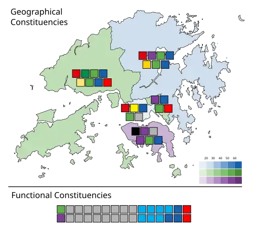 | Parties and allegiances | Geographical constituencies | Functional constituencies | Total seats |