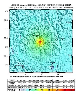 - ^ "Magnitude 5.6 – SICHUAN-YUNNAN BORDER REGION, CHINA". United States Geological Survey. August 30, 2008. Archived from the original on September 2, 2008. Retrieved September 1, 2008.