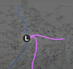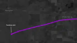 Past New Hartford, the tornado weakened dramatically and passed just north of Waterloo and Cedar Falls, shrinking to about 14 mile (400 m) in width as it continued to impact rural areas. Damage along this section of the path was mostly minor, though a few farms sustained EF2 damage. Intense cycloidal marks were again noted in farm fields in this area.[1][2] As the tornado approached Dunkerton, it turned to the east-northeast, missing the town and growing up to 1.2 miles (1.9 km) wide. Some re-intensification occurred in this area, as consistent high-end EF2 damage was noted at multiple farms. Numerous hog containment buildings were destroyed, and a few homes that were impacted sustained some collapse of exterior walls. Mud and corn stubble was picked up from farm fields near Dunkerton and plastered thickly against fences, power poles, and houses. Shortly before reaching Fairbank, the tornado abruptly dissipated.[1][2]