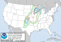 By May 21, models showcased an increasingly strong and robust negatively-titled trough rapidly moving across the United States before slowly stalling through the central plains. A large ridge present was set to breakdown, allowing a strong surface front to move across the area as well. Moderate instability was already forming due to a deep forming moist-layer and warm air advection from the south. The National Weather Service indicated that the "Combination should be sufficient for a multiple-day threat for relatively widespread severe storms."[3]