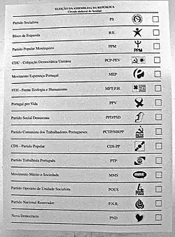 1. ^ The Portuguese Communist Party (PCP) and the Ecologist Party "The Greens" (PEV) contested the 2005 election in a coalition called Unitary Democratic Coalition (CDU) and won a combined 7.5% of the vote and elected 14 MPs to parliament.