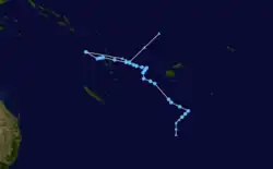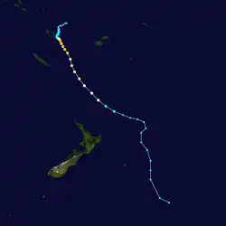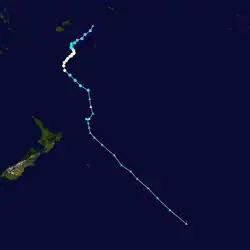 Early on February 13, RSMC Nadi reported that Tropical Disturbance 11F had formed about 65 km to the southwest of Port Vila in Vanuatu.[91] During the next day, the system gradually moved north and started intensifying.[92] Late on February 16, the disturbance turned south-southeast and intensified into a Tropical depression.[93] On the next morning, organization in the system improved, but the convection decreased unexpectedly.[94] Early on January 18, deep convection started developing over the Low-level Circulation Center (LLCC) which is very favorable for Tropical cyclogenesis.[95] Late on that day, the JTWC started monitoring the system as Tropical Cyclone 17P.[96] Early on the next day, RSMC Nadi upgraded the depression into a Category 1 Tropical Cyclone and named it Atu.[97] At midnight, that day, RSMC Nadi upgraded Atu into a Category 2 tropical cyclone,[98] and six hours later it was upgraded again into a Category 3 severe tropical cyclone,[99] and then again into a Category 4 Severe Tropical cyclone.[100] Though Atu strengthened rapidly, it weakened unexpectedly on the next day because of an eyewall replacement cycle.[101] Early on February 23, Atu crossed 25°S and entered TCWC Wellington's area of responsibility as a Category 3 Severe Tropical Cyclone.[102] Late on that day, the JTWC, reporting that the system was becoming extratropical, issued their final warning on Atu.[103] At midnight, that day, TCWC Wellington reported that Atu was no longer a Severe Tropical Cyclone.[104] Within six hours, TCWC Wellington downgraded Atu into a low, no longer considering it tropical.[105]