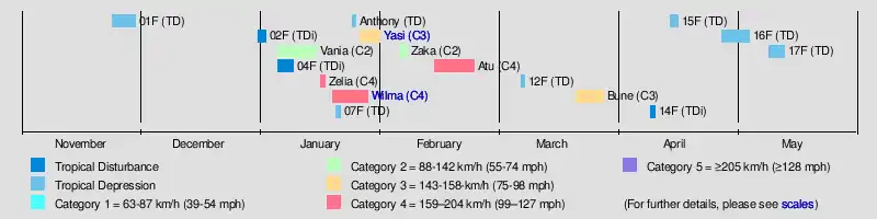 The following tropical disturbances were also monitored by RSMC Nadi, however these systems were either short lived or did not develop significantly. On December 31, Tropical Disturbance 02F had developed within a trough of low pressure about 930 km (580 mi) to the southeast of Pago Pago in American Samoa.[113] Over the next few days the disturbance's organisation slightly increased in an area of low vertical windshear, before RSMC Nadi issued its final advisory on the disturbance as it moved south of 25°S into TCWC Wellington's area of responsibility.[114] A few days later as Cyclone Vania was developing near Fiji, RSMC Nadi started to monitor Tropical Disturbance 04F which had developed within a monsoon trough, about 300 km (185 mi) to the northwest of the New Caledonian capital Nouméa. Over the next few days the disturbance remained weak and poorly organized, before RSMC Nadi issued their final advisory on the system during January 7, as the disturbance was not expected to develop into a tropical cyclone.