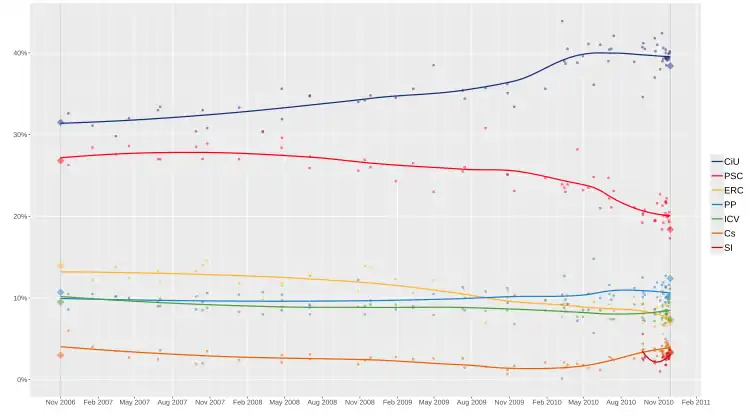 - ^ "Barómetro TNS. Marzo 2010. Clima político y expectativas electorales en Cataluña. Expectativas Elecciones al Parlamento de Cataluña" (PDF). TNS Demoscopia (in Spanish). 26 March 2010. Archived from the original (PDF) on 29 March 2010.