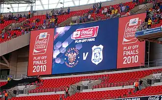 The two teams were competing for promotion to the Premier League, the first tier of the English football league system. The play-off final was held at Wembley Stadium in London. Blackpool had played once before at the redeveloped Wembley, defeating Yeovil Town 2–0 in the 2007 Football League One play-off final.[21] Cardiff had played at the redeveloped stadium on two occasions in 2008, in the semi-final and final of the 2007–08 FA Cup.[22] Neither side had played in the Premier League since the league's decision to break away from the Football League in 1992 and Cardiff would have become the first non-English team to play in the league had they won.[4] Holloway had previously met Cardiff in the 2003 Football League Second Division play-off final seven years previously, when his Queens Park Rangers side lost in extra time.[23]