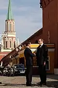 At 10:00 am (MSK), the clock of Spasskaya Tower in the Moscow Kremlin rang and signalled the beginning of the parade commemorating the defeat of Nazi Germany by the Union of Soviet Socialist Republics in the Great Patriotic War. The event then began with the display of the flag of Russia and the Victory Banner. After this, commander of the Moscow Military District Colonel General Valery Gerasimov, who commanded the parade, and Anatoly Serdyukov, the Russian Minister of Defence, who inspected the parade, joined and inspected the troops. At 10:14 am, Serdyukov reported to Supreme Commander-in-Chief, and Russian President, Dmitry Medvedev on the readiness of the troops.[18]