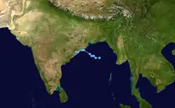 On October 7, the India Meteorological Department (IMD) upgraded an area of low pressure to a depression, giving it the designation "BOB 02". At that time, the depression was located approximately 180 km (110 mi) southeast of Visakhapatnam.[20] Later that day, the IMD reported that the system was 120 kilometres (75 mi) east of Visakhapatnam.[21] On the same day, the IMD reported that the system moved away from Visakhapatnam and maintained strength. The system was forecast to make landfall between Gopalpur and Paradip overnight but the depression made landfall over Paradip late on October 7 instead.[22] On October 8, the IMD reported that the system had weakened slightly.[23] Later on that day, the IMD reported that the depression had further weakened.[24] The storm made its second landfall at Kolkata, West Bengal, India.[25] Signal 3 cyclone alert was issued at the Maritime ports of Chittagong, Cox's Bazar and Mongla.[26] The Depression continued to weaken as it moved northwest until it was caught up in the jet stream and completely absorbed by a non-tropical storm early on October 9.[27]