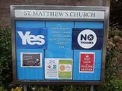 Campaign material from both sides of the 2014 Scottish independence referendum on a Church notice board in Perth.