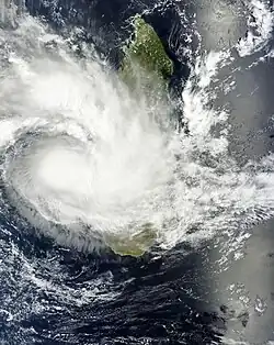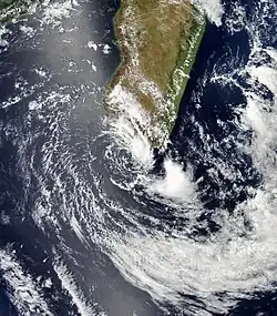 On February 7, a tropical disturbance formed in the South Indian Ocean. On February 9, RSMC La Réunion reported that the disturbance has strengthened into Tropical Depression 09 and was located south-southwest of Diego Garcia. On the same day, the JTWC upgraded it to a tropical storm designating as 12S, and the storm intensified into a moderate tropical storm named Giovanna later. On February 10, Giovanna continued strengthening into a severe tropical storm. Late on the same day, Giovanna went through explosive intensification and became an intense tropical cyclone. Soon, Giovanna began an eyewall replacement cycle and weakened into a tropical cyclone on February 11,. However, the wind shear surrounding Giovanna weakened, so Giovanna was able to strengthen back into an intense tropical cyclone with a larger eye on February 13,. At about 22:00Z on February 13, Giovanna made landfall near Andovoranto in Madagascar, and it rapidly weakened into an overland depression on February 14. Early on February 15, Giovanna moved off the western coast of Madagascar and into the Mozambique Channel, as the storm gradually began to reorganize. Over the next few days, Giovanna curved around the southern part of Madagascar, due to a strong anticyclone over the area. On February 18, as Giovanna moved eastwards, along the bottom of Madagascar, the storm was steered into warmer waters, where it strengthened into a Category 2 tropical cyclone again, and developed a small eye. However the new eye soon underwent an eyewall replacement cycle, and developed double eyewalls, due to moderate wind shear. On February 20, Giovanna entered an area of strong vertical wind shear, which quickly weakened the system into a tropical depression, and displaced the system's convection to south of the system's exposed circulation center. This caused Giovanna to degenerate into a remnant low on February 22, with the low level circulation center totally later that next day.[37] The exposed remnants were soon pushed further northwestward the next day, due to a Fujiwhara interaction between a stronger system to the east, Moderate Tropical Storm Hilwa. On February 24, Giovanna's remnants dissipated to the east of Madagascar.