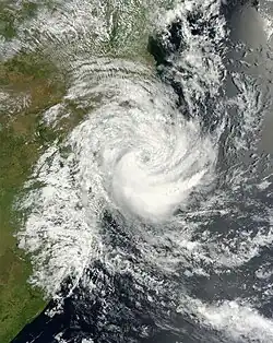 The system then made a small loop off the coasts of Mozambique and South Africa before starting to head in a northwestern direction towards Madagascar yet again due to weak steering conditions. The official death toll as of March 6, stood at 77, including at least 65 dead in the island nation, most of them in the southeastern Ifanadiana district. Five fishermen were killed of the Mozambique coast and at least 3 more people in the south of the country when a tree fell on their roof and collapsed it. South Africa reported four fatalities as waves of up to 3 m battered the port of Durban and forced all ships to seek safety. Irina is the deadliest storm of the season so far, and took the total death toll of the 2011–12 season to 164, the highest since the 2006–07 season.[40] Later on March 6, wind shear began taking its toll on the system, and much of the storm's convection in the outer rain band were eroded away. As the storm continued to move towards Southern Madagascar, the wind shear removed more of the storm's convection, even as the storm continued to weaken. On March 7, Irina began to stall. Early on March 8, only a small amount of convection remained, which was wrapped around the center of circulation. Early on March 9, Irina's eye disappeared, as the storm continued to weaken. As the storm turned back towards South Africa, it lost its organization, due to the strong wind shear. Early on March 10, RSMC Reunion issued their last advisory on Irina, as the storm degenerated into a remnant low.[44] Over the next 2 days, Irina's remnant low continued to drift northwestwards. On March 12, Irina's remnants made landfall over the Gaza Province, and dissipated.