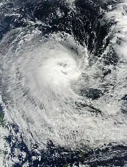 Early on January 19, RSMC La Réunion declared the disturbance Tropical Depression 08, shortly before the JTWC also initiated advisories and declared the depression "Tropical Cyclone 08S" as it became equivalent to a tropical storm. Later that day the Malagasy national weather service named the storm Funso before early the next day as it continued to intensify quickly, RSMC La Réunion declared that Funso had intensified into a tropical cyclone. Due to land interaction, Funso weakened slightly on January 22–23, but soon reintensified into an intense tropical cyclone as it started heading south. Although the core of the storm remained offshore, over three million people were affected by tropical storm-force winds.[28] Funso strengthened a little more on January 24, as it continued to move southward slowly. However, early on January 25, Funso began to weaken, due to an eyewall replacement cycle. remarked that Funso weakened below intense tropical cyclone intensity early on January 25.[29] At the same time, the JTWC estimated the cyclone intensified further to peak 1 minute sustained winds of 220 km/h (135 mph), based on estimates via the Dvorak technique. The agency noted that the eyewall replacement cycle finished and produced a well-defined eye 28 km (17 mi) in diameter.[30] At 1200 UTC on January 25, MF again upgraded Funso to an intense tropical cyclone,[31] and later that day, the cyclone began another eyewall replacement cycle, and started to develop a larger eye, measuring 55 km across.[32] On January 27, Funson underwent yet another eyewall replacement cycle on January 27, as it started weakening.[33] On the next day, Funso became extratropical, due to strong wind shear and colder waters. For the next few days, Funso's remnants moved eastward, before dissipating on February 1.