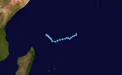 On December 6, Météo-France declared a tropical disturbance a tropical depression.[5] On December 7, the cyclone entered an area of strong vertical wind shear causing the low level circulation centre to become exposed. Soon afterwards, Tropical Depression 02 dissipated to a remnant low. However, early on December 8, the system regenerated into a weak tropical depression. Later on December 8, convection redeveloped, and wrapped around the low level center, even as the storm continued moving westward, as it slowly weakened. Late on December 9, Météo-France issued their last advisory on the storm as it weakened below tropical depression intensity.[6] However, the remnants continued to persist for the next several days with an exposed low level circulation center. But on December 16, the remnants dissipated completely in open waters, due to the high wind shear.