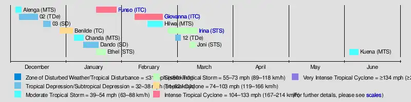 Ethel January 17–22 Severe tropical storm 100 km/h (60 mph) 972 hPa (28.70 inHg) Rodrigues Unknown 1 [53]