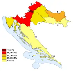 Since 1999 Croatia has been divided into 10 Croatian Parliament electoral districts, named using Roman numerals. These districts are roughly based on geography, but shaped according to the number of voters so that each district holds roughly the same number of registered voters, around 400,000.[22] These districts therefore do not correspond to the borders of top administrative divisions within Croatia and each district contains one or more or parts of several Croatian counties.