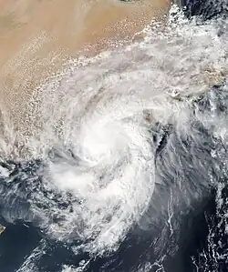 Under the influence of a low-level trough, a low-pressure area formed over the Arabian Sea in late October. The system organized and the IMD designated the system Depression "ARB 02".[35] The depression moved toward the Middle East during the next few days and intensified into a Deep Depression on November 1.[36] In the morning of November 2, IMD upgraded the deep depression into a cyclonic storm and assigned it the name Keila.