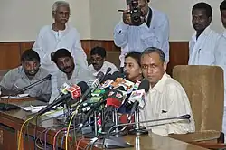 Tamil Nadu Congress Committee president K. V. Thankabalu confirmed the continuation of his party's alliance with DMK on 21 January.[33] DMK pulled out of the ruling coalition at the centre on 5 March amid disagreements with Congress over seat sharing.[34] After three days, the parties struck a deal in which DMK gave in to the demand and allowed Congress to contest in 63 seats.[35] Abdul Rahman, Member of Parliament from Vellore constituency announced the continuation of Indian Union Muslim League's coalition with DMK on 24 January 2011.[36] After meeting Karunanidhi at his home on 16 January, Viduthalai Chiruthaigal Katchi leader Thol. Thirumavalavan said his party will work for the victory of DMK coalition.[37] In a speech given during the wedding of Hindu Religious and Charitable Endowments Minister Periyakaruppan's son in Chennai, Karunanidhi expressed his desire to step down from Chiefministership and continue as the leader of the party.[38] Karunanidhi, during his trip to New Delhi for attending Chief Ministers meeting on 30 January, said that Indian National Congress, Viduthalai Chiruthaigal, Muslim League and Pattali Makkal Katchi are in the DMK coalition.[39] But Ramadoss, the leader of PMK denied that and said no final decision has been taken on coalition.[40] However PMK later joined the DMK alliance and was allotted 31 seats. It was later reduced to 30 to accommodate Congress which was firm on contesting 63 seats. Mylapore MLA and actor-turned politician S. V. Shekhar, joined Congress on 6 February 2011 after being expelled from AIADMK in 2009.[41] Although Mylapore constituency was allotted to congress party, it did not give the chance to S.V. Shekhar. Instead the party allotted it to Jayanthi Thangabalu, the wife of TN Congress president K.V. Thangabalu. However her nomination was rejected by election commission citing incomplete submission of relevant documents. The nomination of K.V. Thangabalu, who was the replacement candidate was accepted making him the official congress candidate.[42]