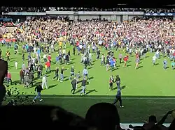 Vale held second place going into April, and though they failed to capitalize on their rivals dropping points on 1 April, they managed to come from behind to two Marc Richards goals at Chesterfield to secure a point. Four days later, Vale hosted fourth-placed Burton Albion in what was labelled as the biggest game of the season for the "Valiants".[43] Reduced tickets of £9 ensured a crowd of 10,978. They were treated to a comprehensive 7–1 victory as Lee Hughes scored a hat-trick.[44] Bottom-placed Aldershot were the visitors four days later, and were seemingly fired up after manager Andy Scott took offence to Adams saying that "[Aldershot] are down the bottom because [they] deserve to be"; Scott stated that "Sometimes managers say things to deflect from what is going on at their own club. We will find out if they have got the stomach for the fight and see if they want to get promoted as they have got a few clubs chasing them."[45] The match proved to be low on action, and Vale surrendered a half-time lead to draw the game 1–1. On 12 April, it was confirmed that Burge had left the club by mutual consent.[46] Vale could have won promotion the following day, and seemed to have done so after Liam Chilvers made amends for a horrific first half own goal by heading Vale into the lead on 89 minutes; however, an injury-time equaliser left the Vale still just short of their final target. Automatic promotion was effectively secured with a 2–2 draw against Northampton Town on 20 April, the two unlikely goalscorers were Chilvers and former "Valiant" turned "Cobbler" Lee Collins. Promotion was confirmed with a 1–1 draw with Wycombe at Adams Park on the last day of the season, in what was former favourite Gareth Ainsworth's last game as a player.