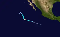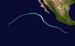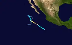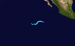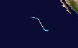 On September 9, an area of low pressure formed west of Central America. The disturbance was expected to strengthen within the next couple of days, with conditions conducive for development.[43] During the next several days, the low edged a little close towards the coast of Western Mexico, but interaction with land did not inhibit further development of this area of low pressure into the eleventh tropical depression of the season.[44] The depression then became Tropical Storm Kristy that same day. The system was insistent on maintaining its intensity even though structure and organization began to collapse because of the unfavorable environment it encountered.[45] September 16, Kristy was downgraded to a tropical depression, and was declared post-tropical the following day, as from a lack of deep convection. The following day, wind warnings were placed in effect for the Baja California Peninisula from the remnants associated with Kristy.[46] Kristy also threatened Southern Mexico.[47] During the next several days, Kristy's remnants turned towards the east before looping back towards the south, until the system dissipated very early on September 20.[48]