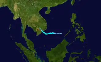 Early on March 30, the JTWC upgraded Pakhar to a Category 1 typhoon, as a banding eye formed; post-analysis later showed that Pakhar didn't reach typhoon intensity.[31][32] Because of land interaction and colder sea surface temperatures, Pakhar weakened to a tropical storm by the next day.[33] On April 1, Pakhar made landfall near Vũng Tàu, Vietnam.[34] As it weakened into a tropical depression, the JMA issued their final advisory by the next day.[35] The system was last noted over Cambodia that same day.[36]