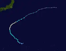 Late on the next day, the JTWC upgraded Sanvu to a category 1 typhoon, as an eye was seen on microwave imagery.[50] Late on May 24, the JMA upgraded Sanvu to a severe tropical storm.[51] Accelerating northeastward along the northwestern periphery of a subtropical ridge, the system reached its peak intensity by the next day, as its eye emerged on satellite imagery.[52][53][54] As its western quadrant got affected by a dry air entrainment on May 26, Sanvu started to weaken as it directly passed over Iwo Jima.[55] With strong vertical wind shear associated with a subtropical jet stream, along with rapidly cooling sea surface temperatures, the system continued to weaken.[56] The JTWC downgraded Sanvu to a tropical storm late on the same day, as the system's low level circulation center started to become exposed.[57] The JMA followed suit by the next day.[58] The JTWC subsequently issued their final advisory on Sanvu, as it commenced extratropical transition.[59] However, the JMA continued issuing advisories on Sanvu, until by the next day, when it fully transitioned into an extratropical cyclone.[60][61] The remnants of the system was last noted during May 30.[62]