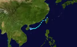 On June 16, the JMA started to issue advisories on a tropical depression, located to the east of Hainan, China.[113] By the next day, the JTWC issued a TCFA on the system, as deep convection was consolidating to its low-level circulation center.[114] The JMA later upgraded the system to a tropical storm, naming it Talim.[115] The JTWC subsequently started to issue advisories on Talim, as convection was quickly developing northward into the center.[116] On June 18, the JTWC upgraded Talim to a tropical storm, as a scatterometer pass supported gale-force winds on the southern periphery of the system.[117] However, as it moved east-northeastward, moderate to strong wind shear caused its deep convection to be displaced to the south, leaving its center partially exposed.[118] By the next day, the system's center became fully exposed due to the continued effects of high wind shear.[119] Despite that, Talim strengthened into a severe tropical storm.[120] On June 20, the JMA downgraded Talim to a tropical storm, as the system tracked towards the Taiwan Strait.[121][122] The PAGASA later assigned the local name Carina on the system, as it entered the Philippine Area of Responsibility.[123] Late on June 20, both the JMA and the JTWC downgraded Talim to a tropical depression, as land interaction significantly weakened the system's organization.[124][125] The JTWC issued their final advisory on the system by the next day.[126]