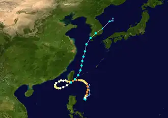 Late on June 7, a tropical disturbance formed south-southeast of Pohnpei.[92] By the next day, the Joint Typhoon Warning Center (JTWC) issued a Tropical Cyclone Formation Alert on the system, but cancelled it late on June 9.[93][94] The JMA upgraded the low-pressure area to a tropical depression early on June 11, with the JTWC subsequently following suit.[95][96] Early on the next day, the JTWC upgraded the system to a tropical storm, and later the JMA also upgraded it to a tropical storm and named it Guchol.[97][98] Early on June 14, the JMA upgraded Guchol to a severe tropical storm, and the PAGASA assigned the local name Butchoy on the system as it entered the Philippine Area of Responsibility.[99][100] Later that day, the JTWC upgraded Guchol to a category 1 typhoon, as convection started to organize.[101] It continued to intensify into a category 2 typhoon on June 15, as it became better organized and started to develop more convection.[102] As Guchol went through rapid intensification with a well defined eye on June 16, the JMA upgraded it to a typhoon early that day, and the JTWC upgraded it further to a category 3 typhoon, and later a category 4 super typhoon.[103][104][105] Guchol reached peak intensity late on June 17,[106] before it began to undergo an eyewall replacement cycle as the storm weakened under moderate vertical wind shear on June 18,[107] and later started its extratropical transition. The JTWC downgraded Guchol to a tropical storm on June 19, as it made landfall over Kii Peninsula in Japan.[108] Later that day, the JMA downgraded Guchol to a severe tropical storm, as it traversed Japan.[109] On June 20, the JMA issued their last advisories on Guchol, as it fully transitioned into an extratropical cyclone northeast of Japan.[110]