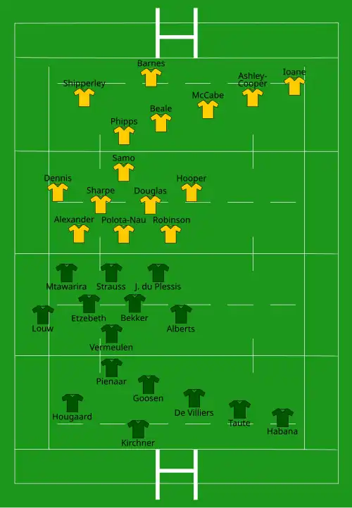 | Try: Higginbotham 56' c Alexander 68' c Con: Barnes (2/2) 55', 69' Pen: Barnes (4/4) 18', 29', 48', 63' | Report[15] | Try: Habana 20' c Con: M. Steyn (1/1) 20' Pen: M. Steyn (2/3) 3', 67' F. Steyn (2/2) 25', 60' |
