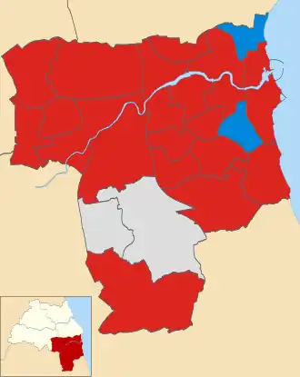 ![]() Map of the 2012 Sunderland City Council election results. Labour in red, Independents in grey and Conservatives in blue. | ||||||||||||||||||||||||||||||||||||||||||||||||||||||